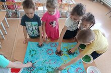Дошкольный возраст – это период, когда изобразительная деятельность может стать и чаще всего является успешной.Наблюдения за эффективностью рисования в детском саду приводят к выводу о необходимости использования нетрадиционных техник, которые создадут ситуацию успеха у воспитанников, сформируют устойчивую мотивацию к рисованию.Вот и в старшей группе №13 ребята познакомились с нетрадиционной техникой рисования- штампование. Рисование штампами способствует развитию у ребёнка: мелкой моторики рук и тактильного восприятия; фантазии и воображения, художественного вкуса.Суть этой техники заключается в том, что изображение получается с помощью прикладывания штампа с краской к поверхности листа бумаги. Приближается великий праздник День Победы, в честь этого ребятам было предложено нарисовать праздничный салют в технике шампования, коллектиный рисунок получился интересным и красочным.
