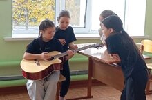 Обучающиеся, занимающиеся в объединении "Баян", учатся игратҗ на гитаре. Рук. Султанова Г.Р.