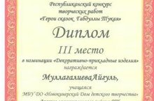 Работы педагогов дополнительного образования Латыповой Р.Н. и Загидуллиной Г.В. заняли 3 место на республиканском конкурсе творческих работ среди детей с ОВЗ "Герои сказок Г.Тукая". Поздравляем их с Победой!