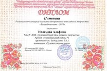 Воспитанница Исламова Альфина (рук. Загидуллниа Г.В.) объединения "Мастера 21 века" заняла 2 место на республиканском конкурсе "Волшебная нить".