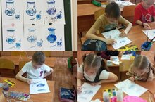 Обучающиеся объединения "Акварель" знакомятся с русским декором и росписью. Сегодня выполнили роспись в стиле гжель. Рук. Бакиева А.Т.