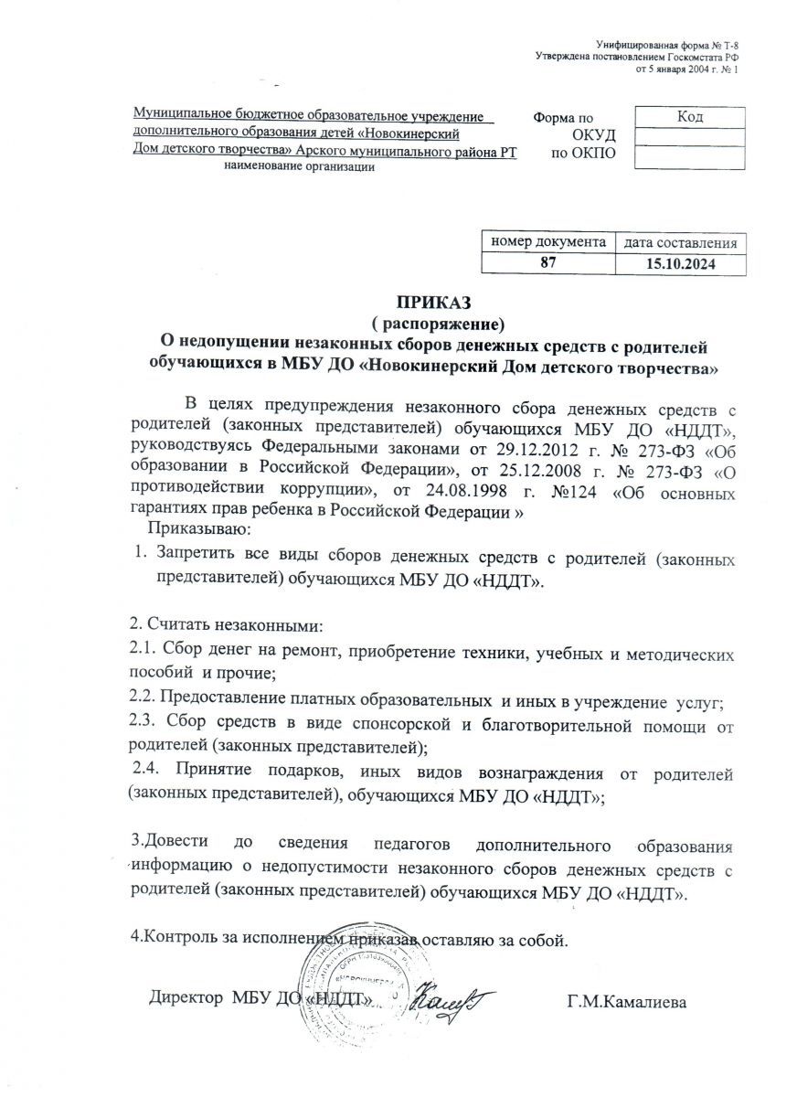 Приказ о недопущении сборов денежных средств с родителей обучающихся