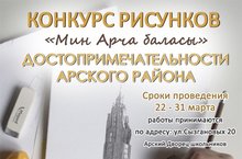 Арский Дворец школьников проводит районный конкур рисунков "Достопримечательности Арского района" в рамках проекта "Мин Арча баласы". Сроки проведения конкурса: 22-31 марта. Возраст участников: 5-18лет. Работы могут выполнены в любой технике. Конкурсные работы принимаются по адресу г. Арск, ул. Сызгановых, д.20. (Арский Дворец школьников)