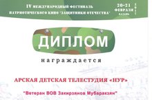 Арская детская телестудия « Нур» стала дипломантом на Международном конкурсе кино « Защитники отечества». Диплом вручили за фильм «Ветеран Великой Отечественной войны Закирзянов Мубаракзян».