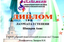 24 ноября 2019 года в г. Казань Международным фестивальным центром «РИТМ» проводился Международный конкурс искусств «ART - Перспектива». В конкурсе принял участие студент 321 группы Шакиров Анис (руководитель Закиров И.И, концертмейстер Маликов М.Г.). По итогам конкурса Анис был удостоен диплома лауреата I степени в номинации «Народный вокал». Поздравляем и желаем дальнейших творческих успехов!