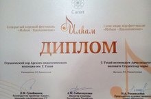 В целях сохранения и развития татарского музыкального наследия и активного приобщения молодежи к классическим исполнительским традициям, к хоровому певческому искусству Татарстанским республиканским молодежным общественным фондом «Сэлэт» 5 декабря 2015 года проводился I Открытый хоровой фестиваль «Илхам – Вдохновение». На фестивале принял активное участие и стал дипломантом студенческий хор ГАПОУ «Арский педагогический колледж им. Г. Тукая» (руководитель Рахматуллин Р.С., концертмейстер Рахматуллин И.С.) Желаем коллективу дальнейших творческих успехов!