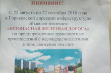 C 22 августа по 22 сентября 2016 года был объявлен месячник "Безопасная железная дорога" по предупреждению транспортных происшествий с несовершеннолетними в зоне движения поездов. В нашей школе были проедены классные часы, беседы по технике безопасности на территории железной дороги.