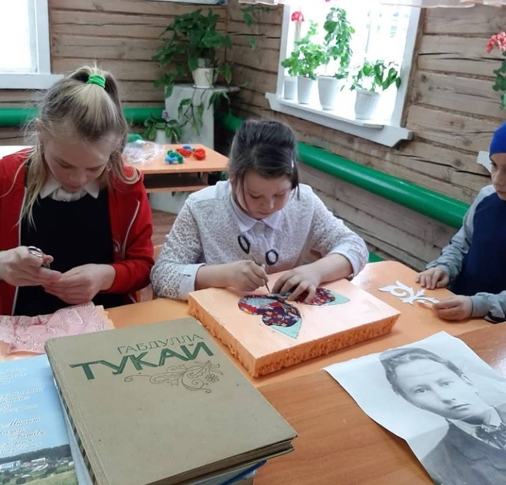Безнең мәктәп укучылары да "Габдулла Тукай геройлары минем янәшәмдә"районкүләм проектында катнашуын дәвам итә. Бүген Кинусайга техникасы ярдәмендә, тукымаларны ябыштырып, картиналар ясадылар. -