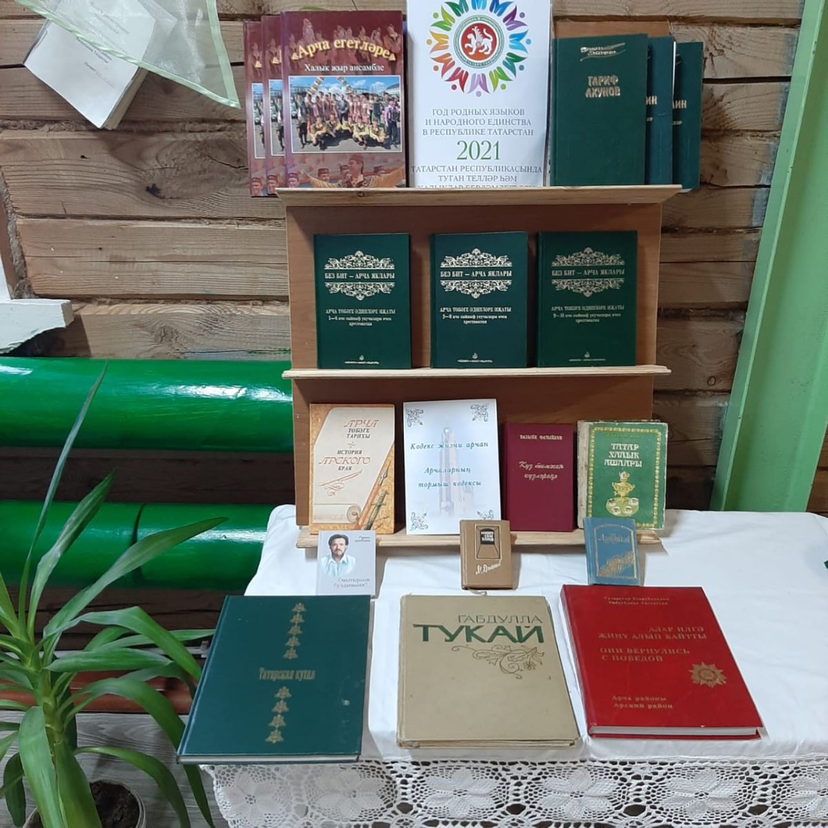 Сегодня в нашей школе организована выставка книг, приуроченная к Году родных языков и народного единства, посвящённых Арскому району,национальным блюдам татарского народа.