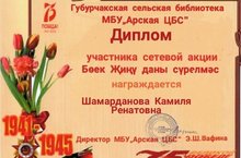 Учащаяся 6 класса Шамарданова К. была награждена дипломом за участие в сетевой акции «Бөек җиңү даны сүрелмәс”.