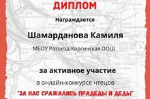 Учащаяся 6 класса Шамарданова К. была награждена дипломом за активное участие в онлайн-конкурсе чтецов «За нас сражались прадеды и деды».