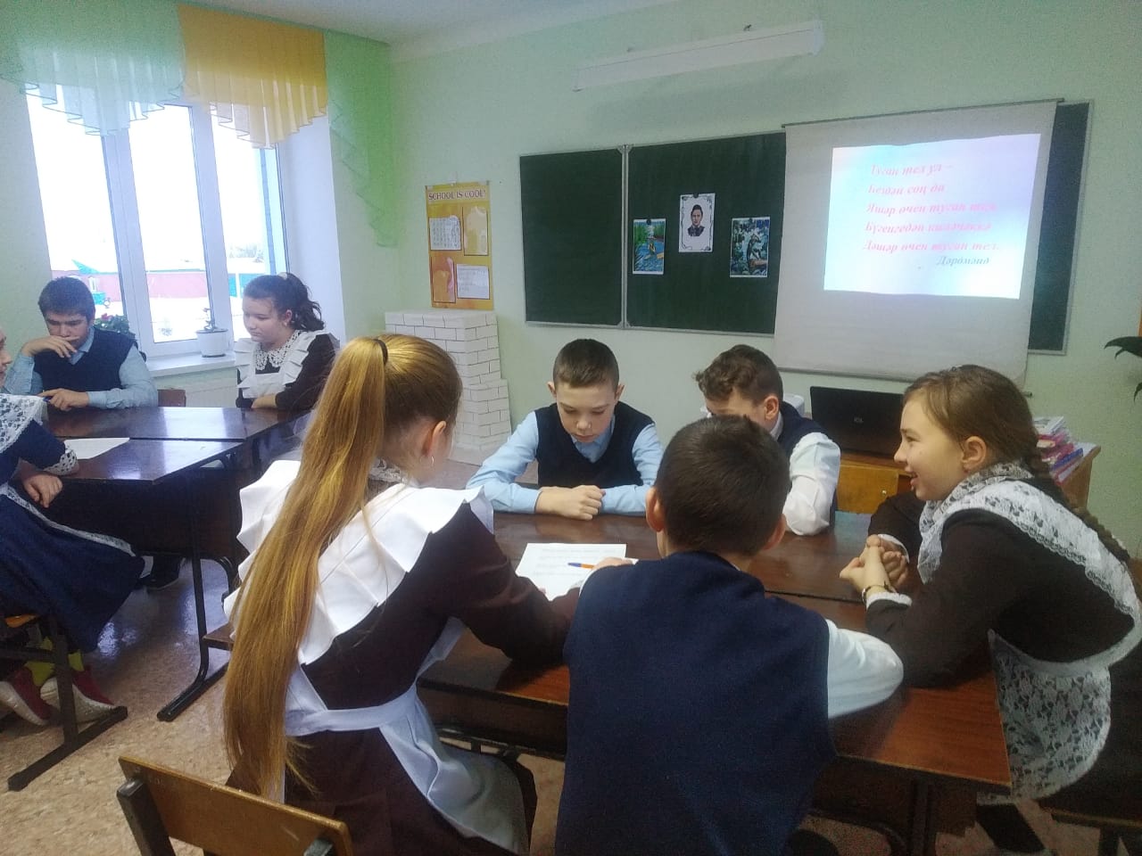 Укучыларда Туган телгә - ана телебезгә мәхәббәт тәрбияләү, тел байлыгын үстерү, туган телнен матурлыгын тоярга өйрәтү максатыннан үткәрелгән чара. Укучылар ике командага бүленеп торле биремнәр үтәделәр: табышмакларга җавап таптылар, мәкальләр, тизәйткечләр эйттелэр, яңа сүзләр ясадылар, туган тел турында шигырьләр сөйләделәр. Ахырдан бергәләп Туган тел җырын җырладылыр.