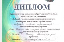 Татар халык шагыйре Габдулла Тукайның 130 еллыгына багышланган “Г.Тукай геройларының кешелеккә мөрәҗәгате” районкүләм яшь иҗатчылар бәйгесендә безнең мәктәптән Хөсәенов Ильназ “ Тукай очырган карлыгачлар” номинациясендә җиңү яулады.Ильназга укуында һәм иҗат эшендә зур уңышлар телибез