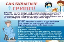 Бүген 9 класста “ Сак булыгыз: грипп!” дигән исем астында класс әгате үткәрелде. Укучылар гриппка каршы профилактик чаралар белән файдалы киңәшләрне дә искә төшерделәр. Татарстанның Сәламәтлек саклау министрлыгы грипптан саклануның иң нәтиҗәле юлы гриппка каршы вакцина ясату дип искәртә. Шулай ук грипп чорында маска кияргә, авыру кешеләр белән элемтәгә кермәскә, кулны сабын белән ешрак юарга,бүлмәне көненә өч-дүрт тапкыр җилләтергә кирәк. Иммун системасын ныгыту өчен С витаминына бай продуктлар: баллы борыч, кара карлыган, гөлҗимеш, кәбестә, киви, апельсин, лимон, грейпфрут ашарга кирәк. Суган белән сарымсакның да файдасы зур. Барыбыз да сәламәт булыйк.