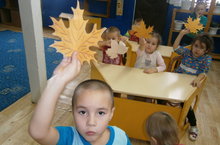 Көзге яфраклар ясадык. Өрәңге яфрагы аеруча кызыклы, үзенчәлекле яфрак. Көз төсмерен күрсәтә торган төс атамаларын да ныгыттык.. Көз турында шигырьләр,сөйләп,җырлар җырлап шөгыльне тәмамладык.