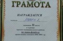 19 октября в спорткомплексе "Арча" состоялся турнир по мини-футболу среди команд юношей 2000-2001 г.р. Арского муниципального района. Команда нашей школы (тренеры Набиуллин Р.Р., Юсупов Р.Р.)заняла II место.