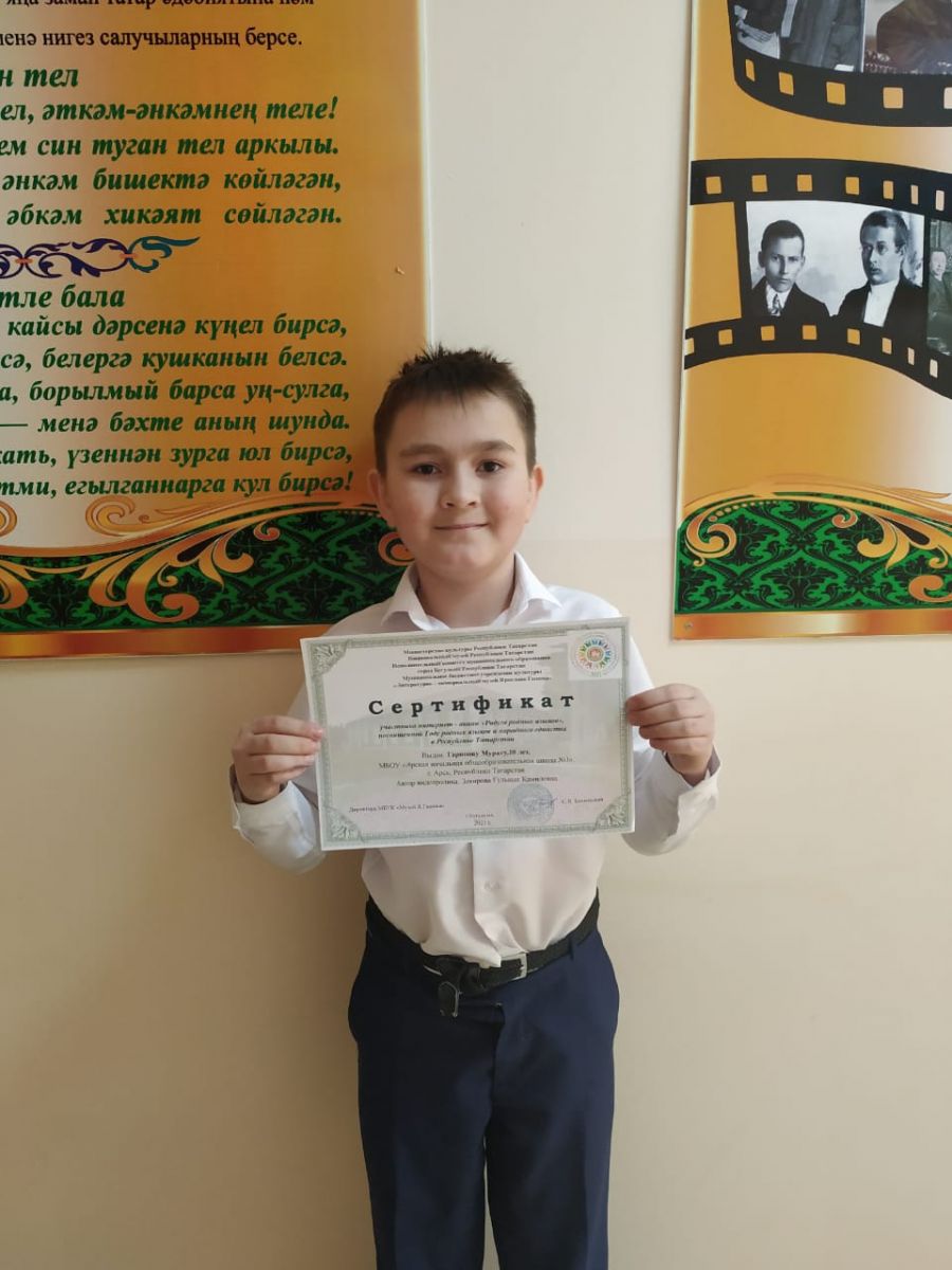 4 нче сыйныф укучысы Гарипов Мурат Туган телләр һәм Халыклар бердәмлеге елына багышланган "Туган телләрнең салават күпере" интернет-акциясендә катнашты һәм сертификат белән бүләкләнде. -