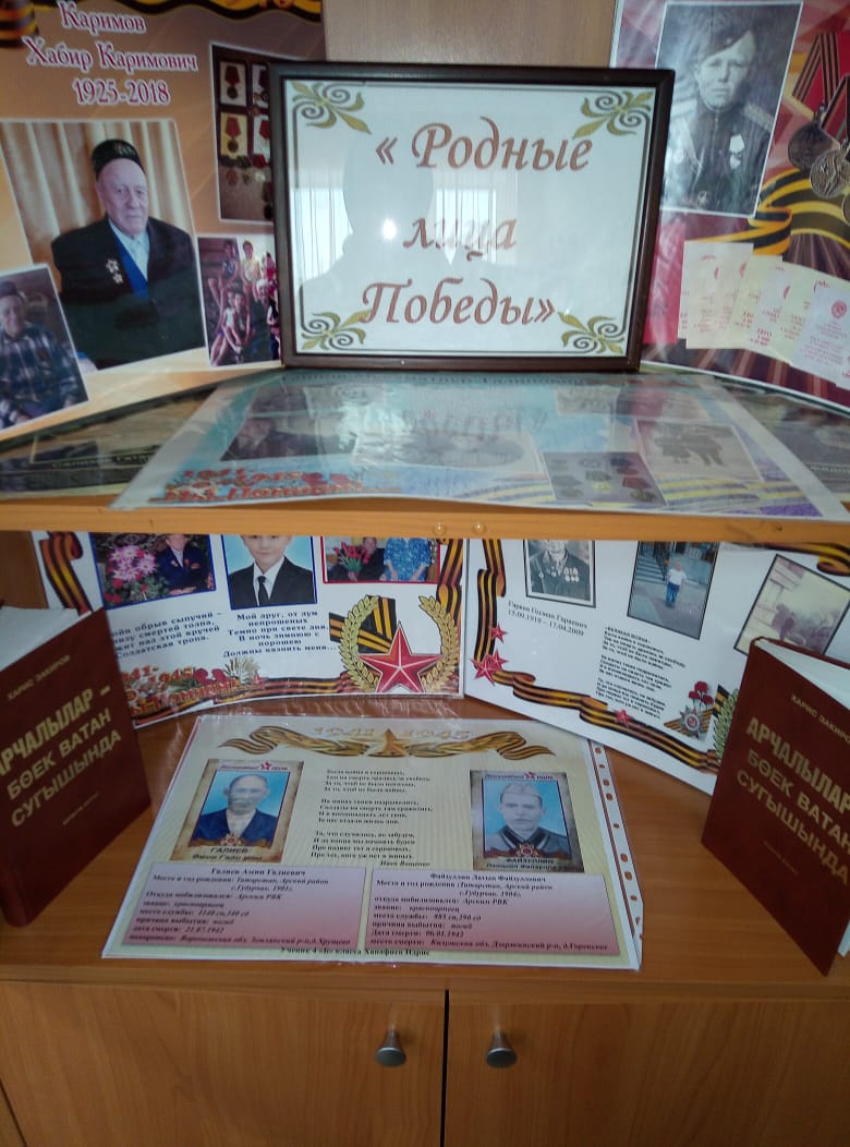 Мәктәбебез китапханәсендә "Җиңүдә таныш йөзләр" исеме астында китап күргәзмәсе оештырылды. Бөек Ватан сугышында катнашкан әби-бабайларыбыз турында мәгълүмат тупланды. Шулай ук Бөек Ватан сугышы елларында кешеләрнең батырлыклары турында китаплар тәкъдим ителде.