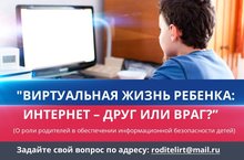 19.01.2018 с 12.00 до 13.30 состоится Республиканское родительское интернет-собрание «Виртуальная жизнь ребенка: интернет – друг или враг?».