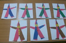 Максат : Клоуннарның тән әгъзалары торышын үзгәртеп төсле кәгазьдән кисәргә өйрәтү.Симметрияле һәм парлап кисүдә композицион күнекмәләрне һәм алымнарны ныгыту.Клоун фигурасын төрле детальләр белән тулыландырырга өйрәтү.Композиция төзү күнекмәләрен ныгыту. -