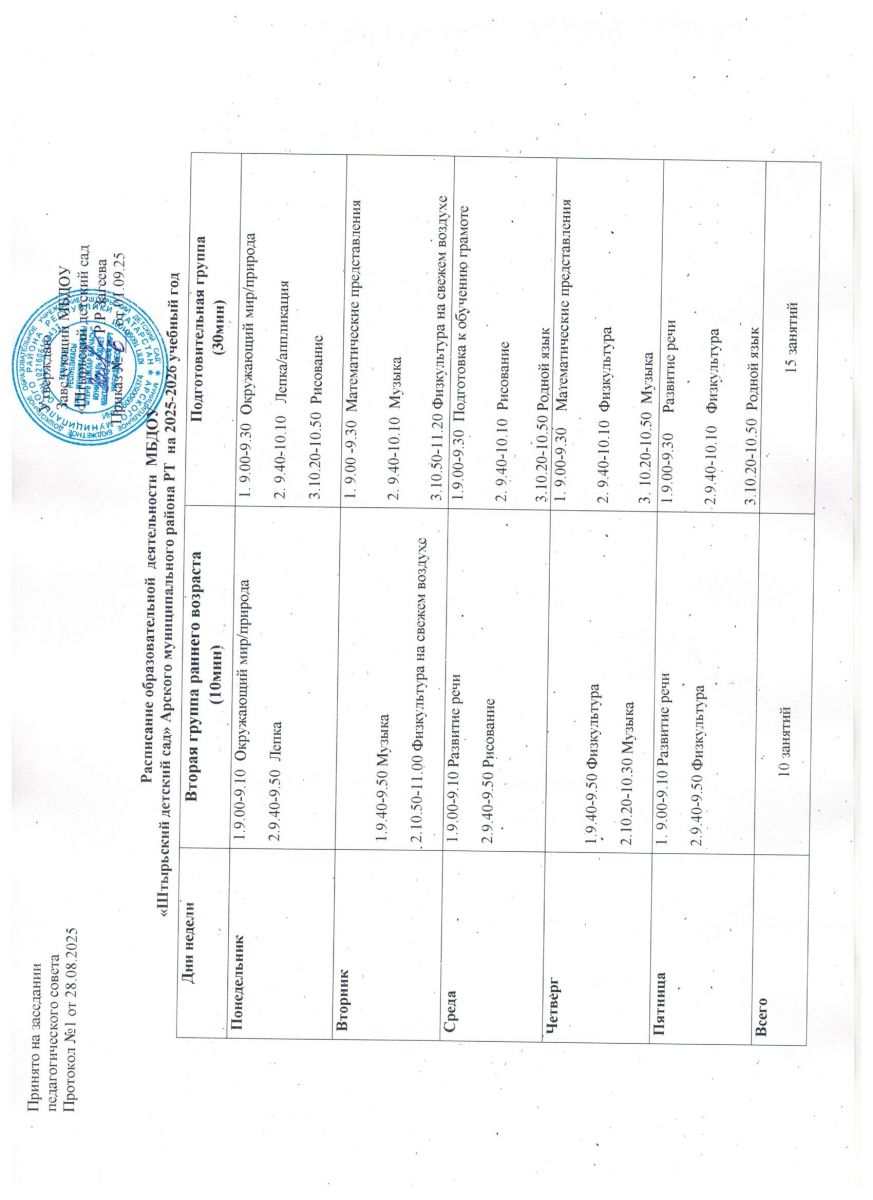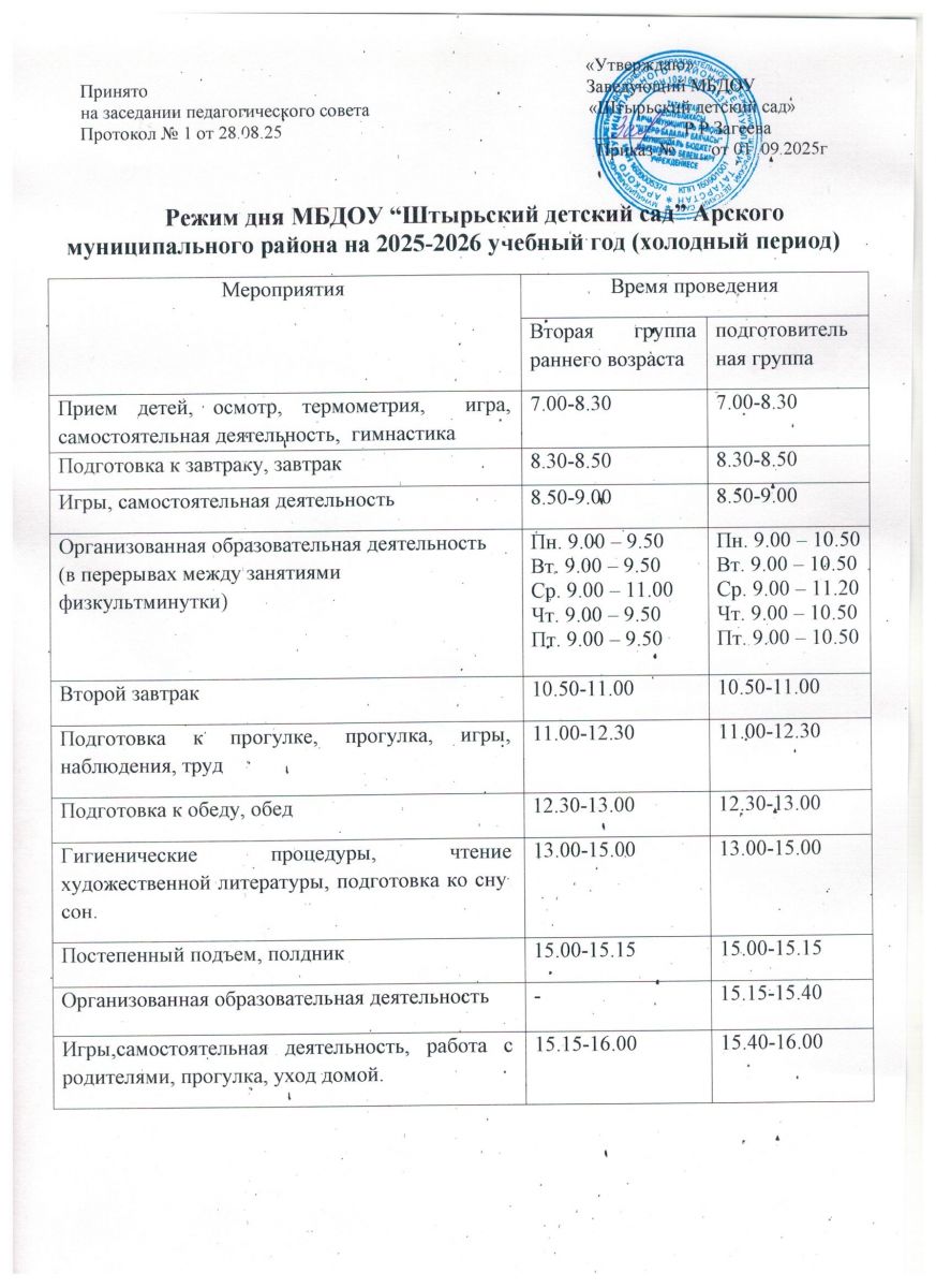 Режим работы детского сада: 5 - ти дневная рабочая неделя; длительность работы детского сада – 9 часов: с 7.00 до 16.00 часов ежедневно, кроме праздничных и выходных - субботы, воскресенья. Основной структурной единицей детского сада является группа детей дошкольного возраста. В группах предельная наполняемость устанавливается в зависимости от возраста детей и с потребностью мест.
