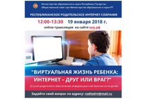 Во исполнение плана работы Министерства образования и науки Республики Татарстан 19.01.2018 с 12.00 до 13.30 состоится Республиканское родительское интернет-собрание «Виртуальная жизнь ребенка: интернет – друг или враг?».