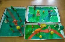 Бүген иртәдән яңгыр яуды.Ләкин балалар барысы да лагерьга килделәр. Балалар бүген әкиятләргә композицияләр эшләделәр. Куркынычсызлык кагыйдәләре аңлатылганнан соң, 5 төркемгә бүленеп, пластилиннан әкият геройлары әвәләделәр.Аларны бик матур итеп урнаштырып,күргәзмә оештырдык.Урыннар билгеләдек.