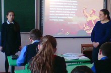 5 класс укучыларына Гүзәл Рүзәлевна Җиңүнең 70 еллыга багышланган тәрбия сәгате үткәрде.Тәрбия сәгатенең темасы "Корал һәм каләм тотып" дип атала.Бу дәрестә сугышта катнашкан шагыйрьләр,язучылар турында мәгълүматлар бик күп тупланган иде.Шулай ук җәлилчеләр турында да аерым тукталып сөйләп кителде. Укучылар кызыксынып тыңладылар, кайбер укучыларга җәлилчеләр турында папка тупларга бирелгән иде.Укучылар герой шагыйрьләрнең шигырьләрен яттан сөйләделәр.
