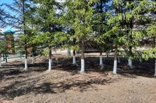 Сегодня на территории школы ,обрезали декоративные кустарники, ели, побелили стволы деревьев и бордюры дорожек, убрали с участка засохшие остатки растений, подмели дорожки.