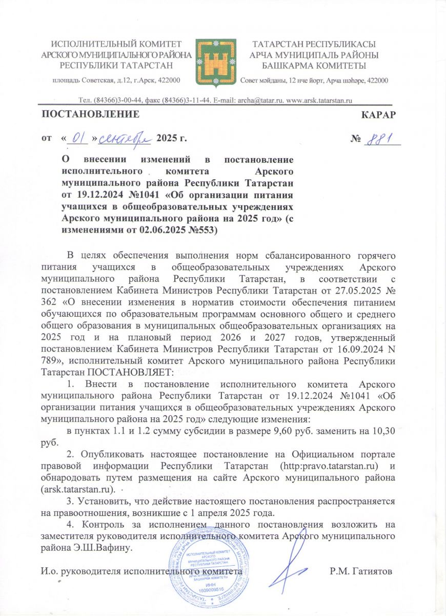 Постановление исполнительного комитета Арского муниципального района РТ от 01.09.2025 №881
