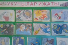 1961 нче елның 12 апрелендә, дөньяда беренче буларак, бортына кеше утырган “Восток” космик корабле җир тирәли орбитага чыгарылды. Бу кеше – очучы – космонавт Юрий Алексеевич Гагарин иде. Ул илебез хөкүмәте тапшырган эшне үтәде. Укучылар рәсем дәресләрендә әлеге темага рәсемнәр ясадылар, аларның эшләреннән күргәзмә оештырылды. -