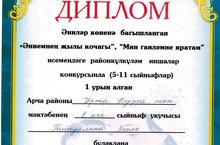 Әниләр көненә багышланган "Әниемнең җылы кочагы", "Мин гаиләмне яратам" исемендәге районкүләм иншалар конкурсында мәктәбебезнең 8 нче сыйныф укучысы Гайнуллина Зилә катнашты һәм 1 нче урынны яулады. (Укытучысы – Юнысова Р.К.) Зиләне җиңүе белән чын күңелдән котлыйбыз, алдагы бәйгеләрдә дә уңышлар телибез.