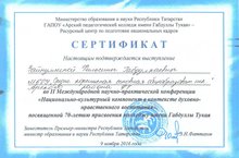 II Международная научно-практическая конференция 09.11.2016 9 ноября в Арском педагогическом колледже имени Габдуллы Тукая прошла II Международная научно-практическая конференция "Национально-культурный компонент в контексте духовно - нравственного воспитания". В ней участвовала и наша учительница русского языка и литературы Зайнуллина Фильсина Габдулхаевна с докладом на тему: "Духовно-нравственная составляющая процесса обучения и воспитания в образовательных организациях".