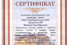 Ученица 7 класса Мингазова Зиля приняла участие в конкурсе научно-исследовательских и творческих работ "Нобелевские надежды КНИТУ - 2015". Представила научную работу (номинация «Дизайн», руководитель-учитель технологии Султанова И.А.), получила сертификат.
