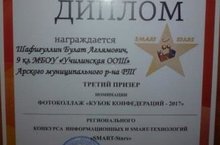 Учащийся нашей школы Шафигуллин Булат под руководством учителя физической культуры Валиевой Г.Р. принял участие в региональном конкурсе информационных и смарт – технологий «SMART-Stars”. Конкурс проводила Поволжская государственная академия физической культуры, спорта и туризма. Работа Шафигуллина Булата в номинации фотоколлаж “Кубок конфедераций-2017” стала призером.