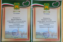 В целях повышения качества иноязычного образования, уровня владения английским языком, создания условий для развития иноязычной коммуникативной компетентности обучающихся прошел муниципальный этап республиканского фестиваля-конкурса школьных театральных коллективов, конкурса стихов и песен на английском языке. В конкурсе приняли участие и обучающиеся нашей школы. Члены жюри отметили высокий уровень подготовки обучающихся к конкурсу. По итогам конкурса в номинации «Стихи на английском языке» Хасанова Самира (5б кл., учитель Г.И.Гатиятова), Якупов Марсель (6 кл., учитель Л.С.Ахметова) награждены Дипломами 2 степени. Поздравляем!