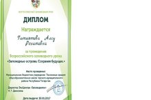Ученице 7 класса Гатиятовой А. удалось попробовать себя в роли педагога. С учащимся 5 класса она провела Всероссийский заповедный урок. Ребятам очень понравилось занятие под руководством председателя Совета Наследников природы, пятиклассники узнали много нового и интересного. За проведение Всероссийского заповедного урока «Заповедные острова. Сохраняя будущее» Гатиятова А. награждена Дипломом. Поздравляем! Молодец, Алсу! Желаем тебе не останавливаться на достигнутом и идти дальше!
