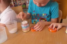 Работа с цветной солью - очень интересное и увлекательное занятие. Детей завораживает как сам процесс окрашивания мелкой соли цветными мелками, так и получившиеся из нее "шедевры" . Сегодня мы делали в этой нетрадиционной технике радужные баночки.
