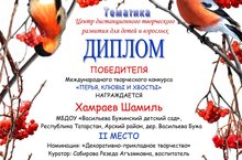 Наши воспитанники активно участвуют в различных конкурсах и викторинах. В октябре месяце мы приняли участие в международном дистанционном творческом конкурсе "Перья, клювы и хвосты" (номинация "Декоративно-прикладное творчество"), где Хамраев Шамиль занял 2 место. Поздравляем победителя и желаем ему новых успехов!!!