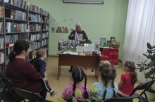 Китапханәче Фәридә Альбертовна балаларны яңа китаплар белән таныштырып тора.