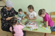 Китапханәче Фәридә Альбертовна балаларны яңа китаплар белән таныштырып тора.