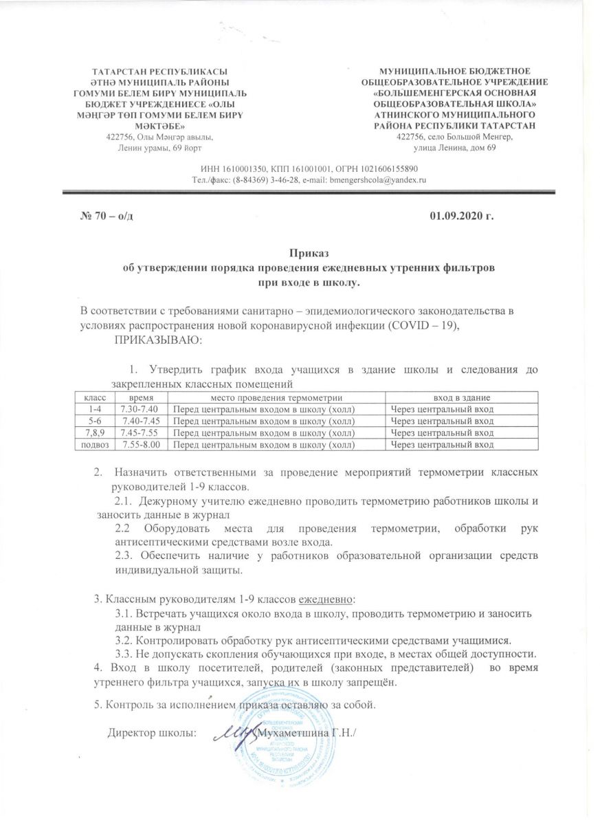 Приказ об утверждении порядка проведения ежедневных утренних фильтров при входе в школу.
