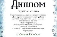 8 октябрь көнне Татарстан Мәдәният министрлыгында ТАССРның 100 еллыгына багышланган анимацион проектка йомгак ясалды. Проектның җитәкчесе, «Татармультфильм» студиясе директоры Азат Ганиев җиңүчеләрне бүләкләде. Алар арасында мәктәбебезнең 3 нче сыйныф укучысы Сабирова Сөмбел (укытучысы Вәлиуллина Ф.Р.) дә бар иде. Ул беренче дәрәҗә Диплом белән бүләкләнде.