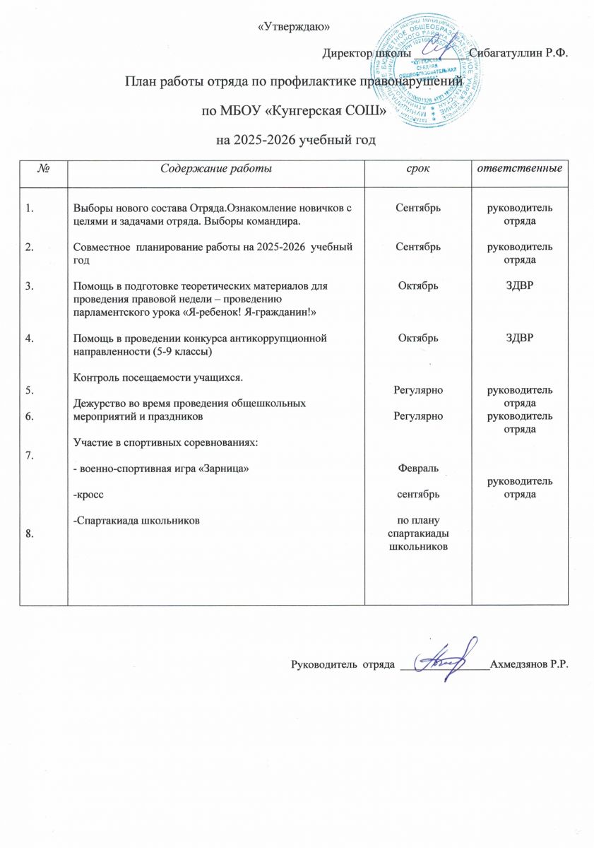План работы отряда по профилактике правонарушений по МБОУ Кунгерская СОШ