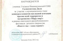 5 нче сыйныф укучысы Галиәхмәтова Дилә «Вместе мы - одна страна!» республика балалар иҗат фестиваленең муниципаль этабында грамота белән бүләкләнде.