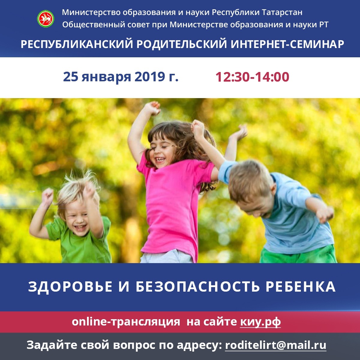 Опубликовано: 22.01.2019Во исполнение плана работы Министерства образования и науки Республики Татарстан 25.01.2019 с 12.30 до 14.00 состоится Республиканский родительский интернет-семинар «Здоровье и безопасность ребенка».