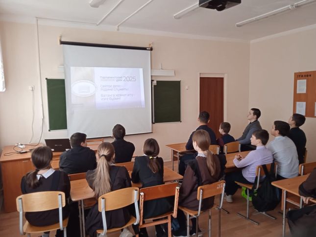 20 февраля 2025 года в рамках "Парламентский урок – 2025" учитель истории Хабибуллин Рамиль Шамилевич провел парламентский урок на тему "Святое дело – Родине служить!"