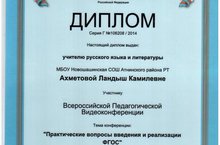 Учительница русского языка и литературы МБОУ "Новошашинская СОШ" Атнинского района РТ Ахметова Ландыш Камилевна участвовала во всероссийской Педагогической Видеоконференции на тему "Практические вопросы введения и реализации ФГОС"