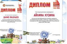 Награждаются дипломами Аскарова Сирина, Хузина Айлина,Шарифзянова Сафина, Фазлыев Данис за участие в республиканском конкурсе творческо- исследовательских работ "Татарстан - фронту!" Рисунок", посвященном 80 - летию Победы в Великой Отечесвтенной войне 1941- 1945 годов.