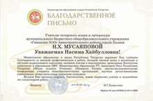 Учитель родного (татарского) языка и литературы Мусаяпова Насима Хайбулловна награждена Благодарственным письмом Министерства образования и науки РТ за высокий профессионализм в работе, большой личный вклад в воспитание и обучение подрастающего поколения, активное участие в мероприятиях, проводимых КФУ, МОиН РТ, АН РТ.